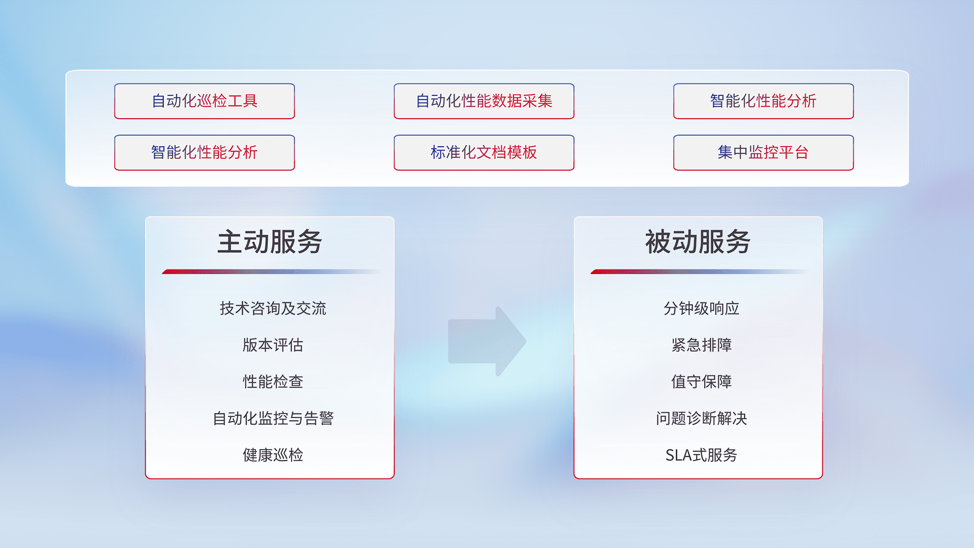 智能化工具和标准化文档,,保障服务质量,,,,提供主动服务(包含技术咨询、、版本评估、、性能检查、、自动化监控与告警、、、健康巡检)和被动服务包含(分钟级响应、、紧急排障、、、、值守保障、、、、问题诊断解决、、、、SLA服务)。。。